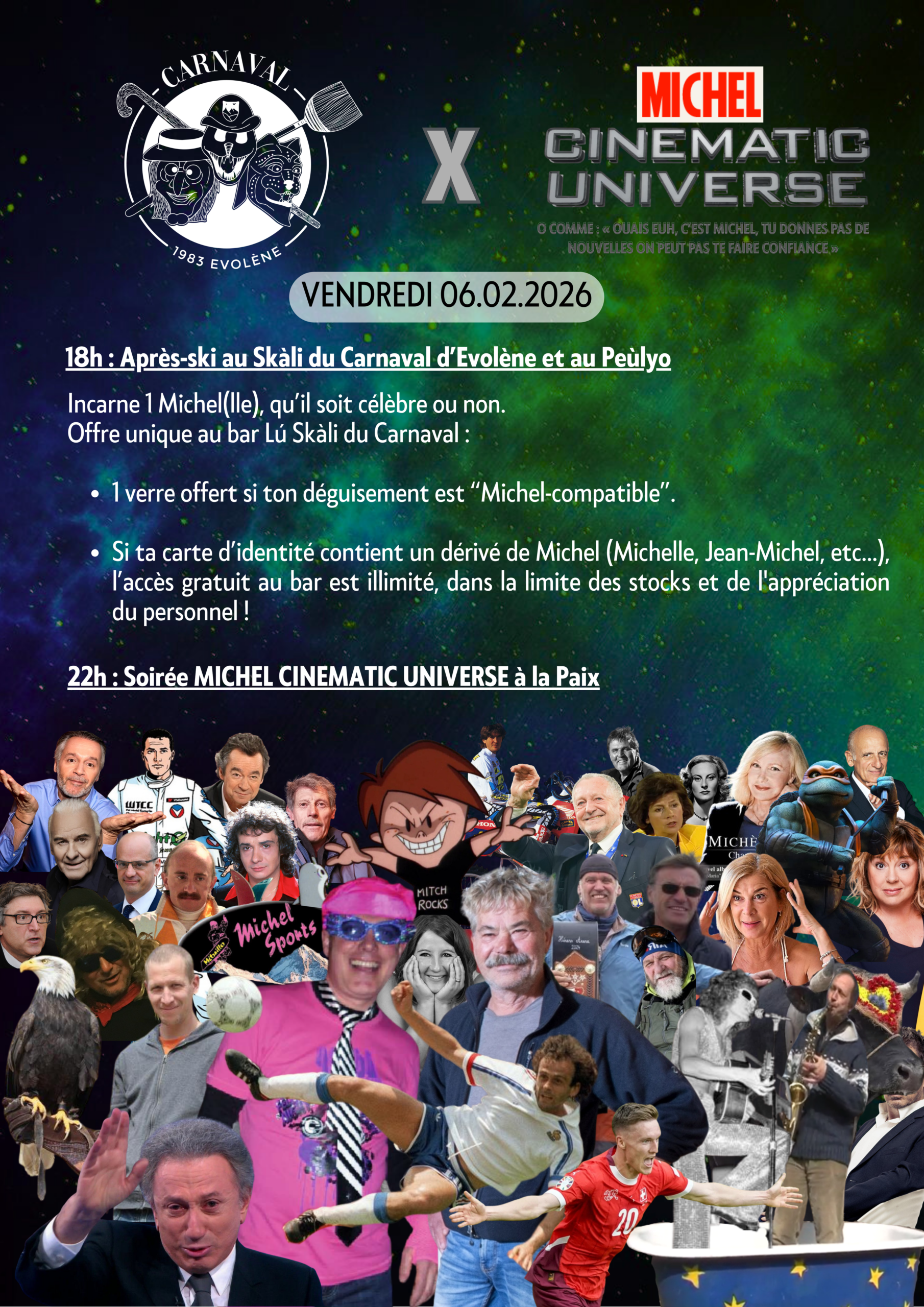 Incarne 1 Michel(lle), qu’il soit célèbre ou non. Offre unique au bar Lú Skàli du Carnaval : 1 verre offert si ton déguisement est “Michel-compatible”. Et si ta carte d’identité contient un dérivé de Michel (Michelle, Jean-Michel, etc…), les consommations au bar sont gratuites et illimitées, dans la limite des stocks et de l’appréciation du personnel ! …